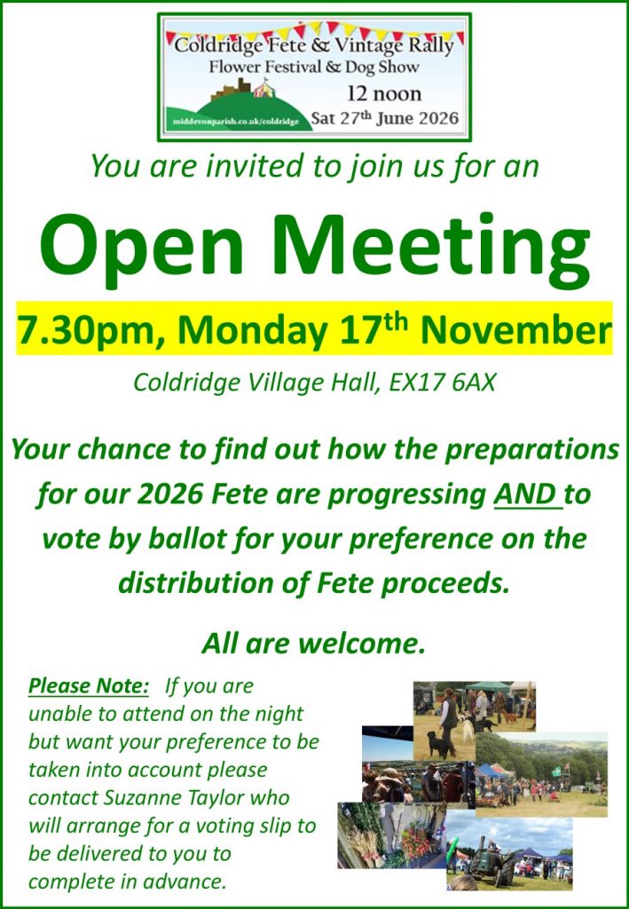 On behalf of the 2026 Coldridge Fete Committee, you are invited to join us for an Open Meeting on Monday 17th November to learn how preparations for the 2026 event are progressing AND to take part in a ballot for your preference for the distribution of Fete proceeds.