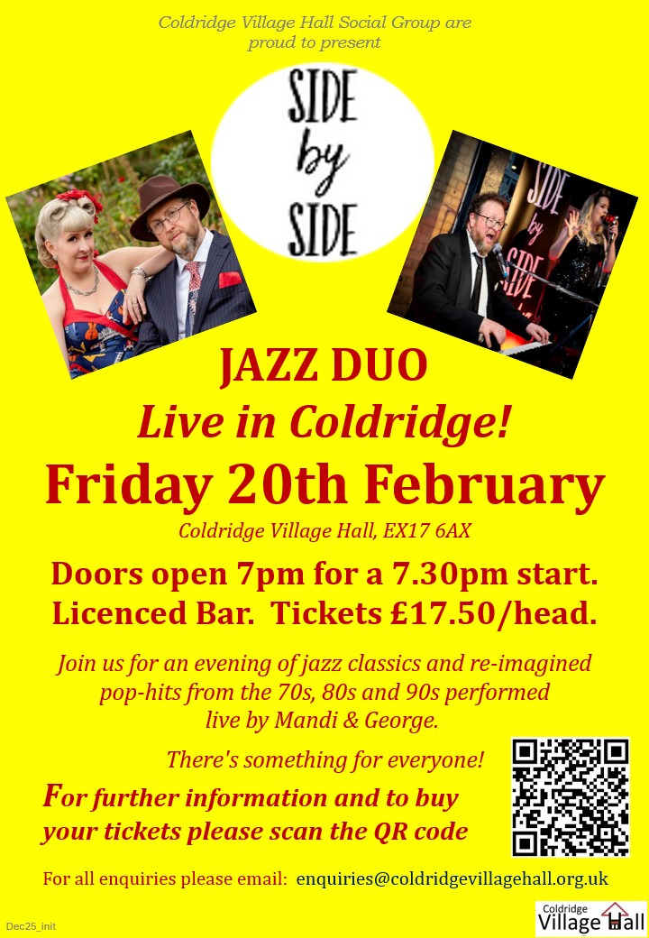 Here’s looking forward to a great evening of live music on Friday 20th February in the intimate surroundings of Coldridge Village Hall!