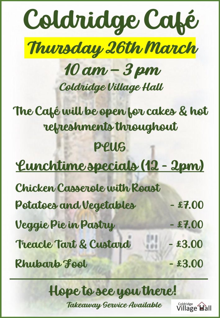 Then why not come along to the March Coldridge Café and enjoy something special from the ‘menu of the day’ which includes cakes, hot & cold beverages along with our hot-lunch option, (mains and dessert), served between noon and 2pm on the day. The March lunchtime options are now available – see below for details.