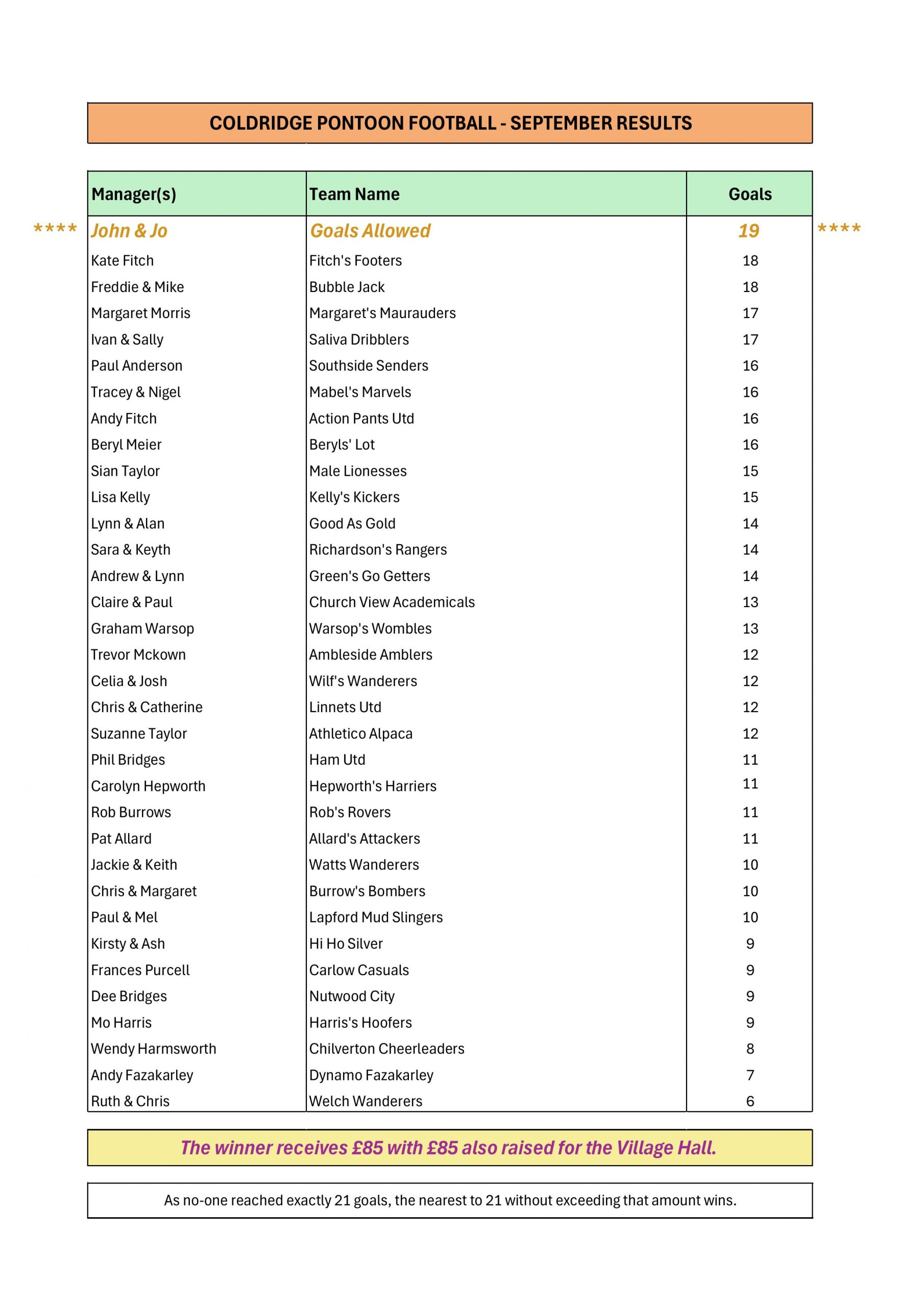 Thanks again to Ian for his diligent scorekeeping, and good Luck to all our managers and thanks on behalf of Coldridge Village Hall for the continued support – your efforts in September helped raise £85 for the upkeep of our beloved Village Hall