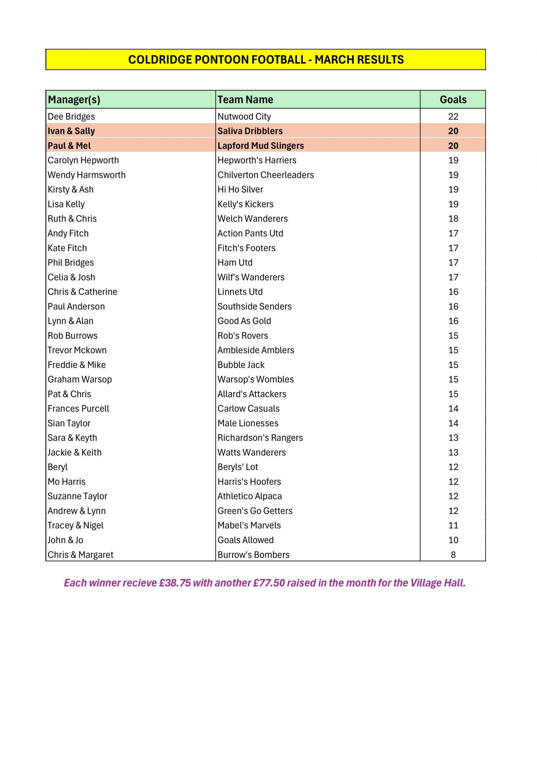 Nutwood City ended on 22, busting by 1, and as no-one scored 21 it’s the closest to that number wins the monthly prize. We have joint winners for the month of March with 20 goals were Lapford Mud Slingers (Paul & Mel) and Saliva Dribblers (Ivan & Sally) each winning £38.75; congrats to both teams !!