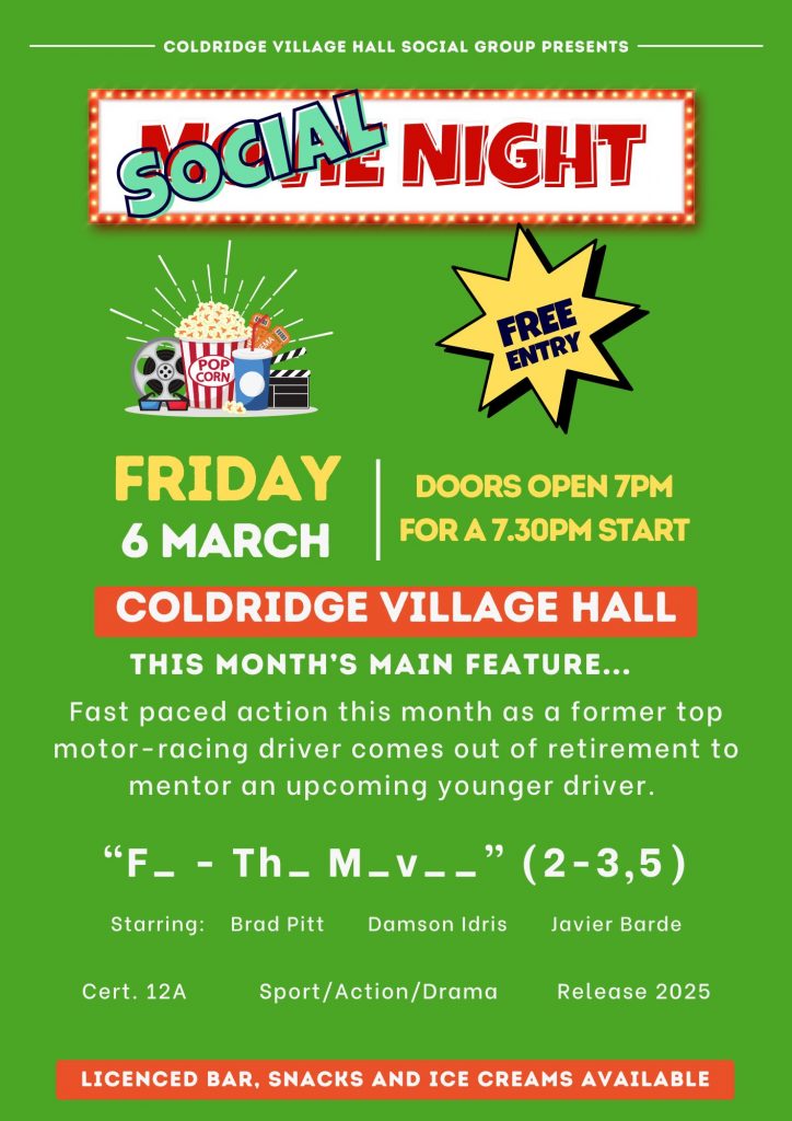 Join us in the Village Hall on Friday 6th March as we host the next in the 2026 season of ‘Coldridge Social Nights (with a film)’.