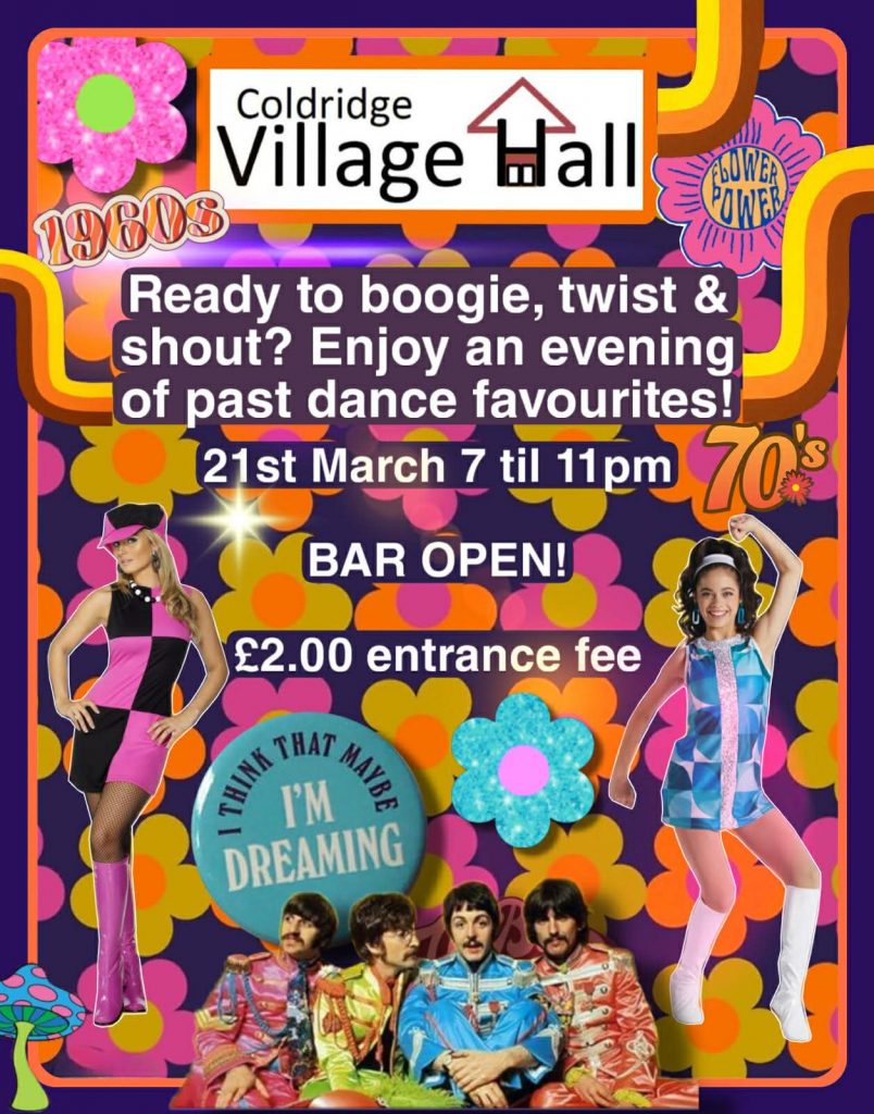 Spring is coming and it’s time to ‘get down’ for a fun 60’s Disco Night in Coldridge Village Hall on Saturday 21st March!