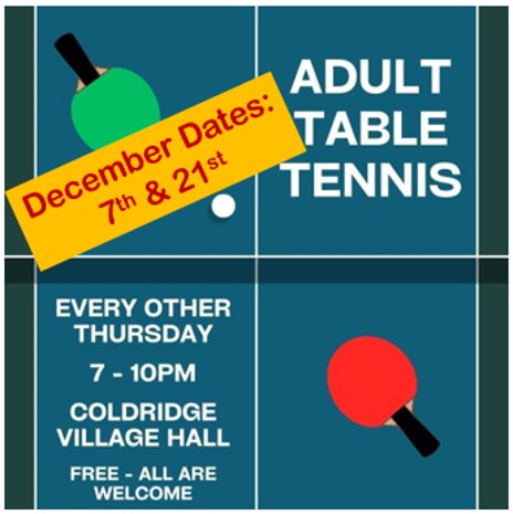 Thursday night is Table Tennis Night, our fortnightlysports social in the Village Hall. Open between 7 & 10pm, entry is free and all are welcome to join-in. No previous skills or expertise required, all the kit is supplied and bar refreshments will be available. If you’re new to Coldridge why not come up to the Hall and meet the regulars. See you there 😉!