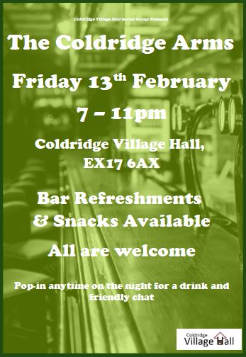 ‘The Coldridge Arms’ will be opening its doors again on Friday 13th February at 7pm, and as ever all are welcome to drop by and join-us on the night to savour something from our licenced bar (either alcoholic or non-alchoholic) accompanied by some bar snack favourites and/or ice creams!