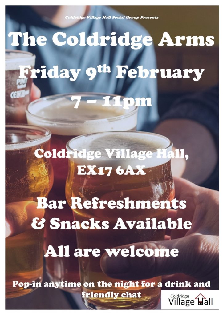 The Coldridge Arms’ will be opening its doors again on Friday 9th February from 7pm. All are welcome to join-us on the night so why not pop-in for a relaxed evening with friends old and new whilst enjoying one of a range of beverages (alcoholic or non-alcoholic), snacks or ice-creams from the bar.