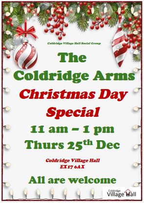 If you fancy a short break from unwrapping the presents or tending to your sprouts then why not pop-in to the Coldridge Arms between 11am and 1pm on Christmas Day and choose something special from what’s on offer from the licensed bar.