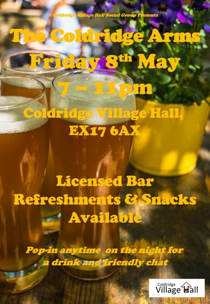 ‘The Coldridge Arms’ will be opening its doors again on Friday 8th May at 7pm, and as ever all are welcome to drop by and join-us on the night to savour something from our licenced bar (either alcoholic or non-alchoholic) accompanied by some bar snack favourites and/or ice creams!