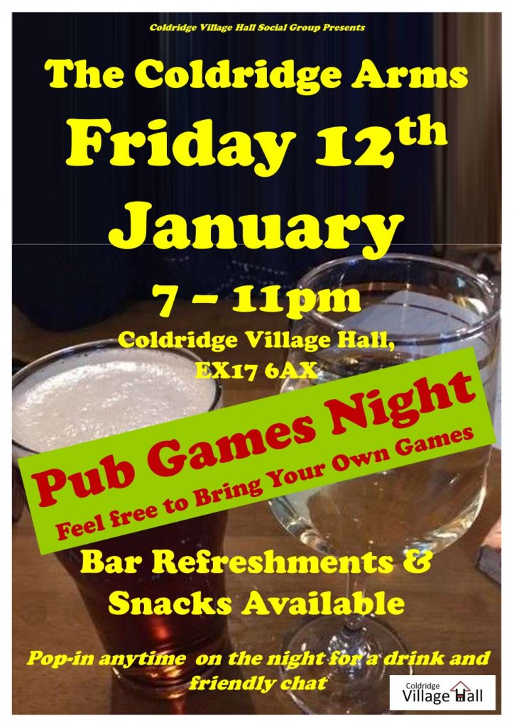 All being well, the Coldridge Arms’ will be open for the first time in 2024 on Friday 12th January from 7pm and we’ll be holding an informal ‘Pub Games Night’ for all.
