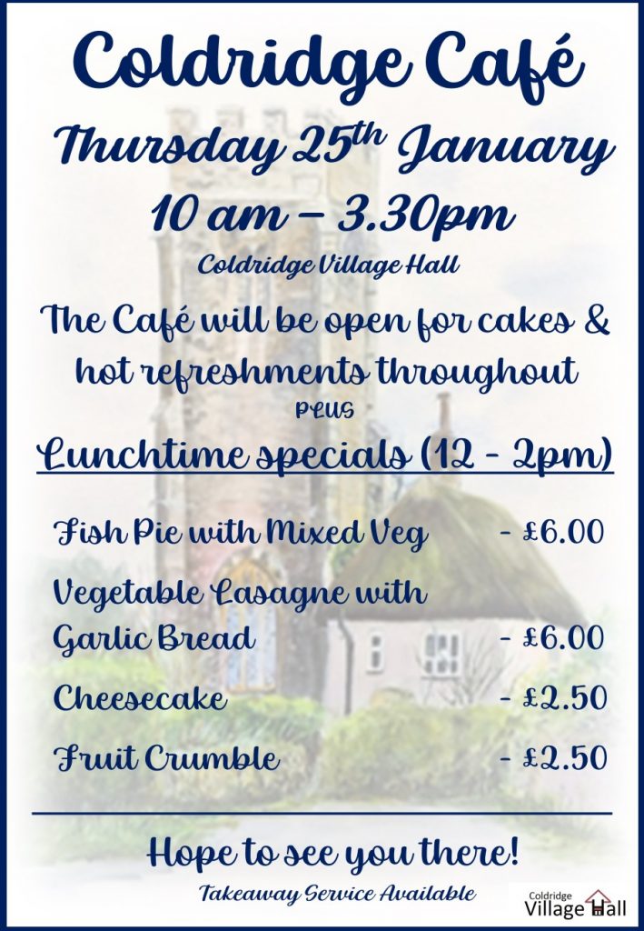 Our next regular Coldridge Café will take place on Thursday 25th January. The lunchtime menu for the day is as follows:-