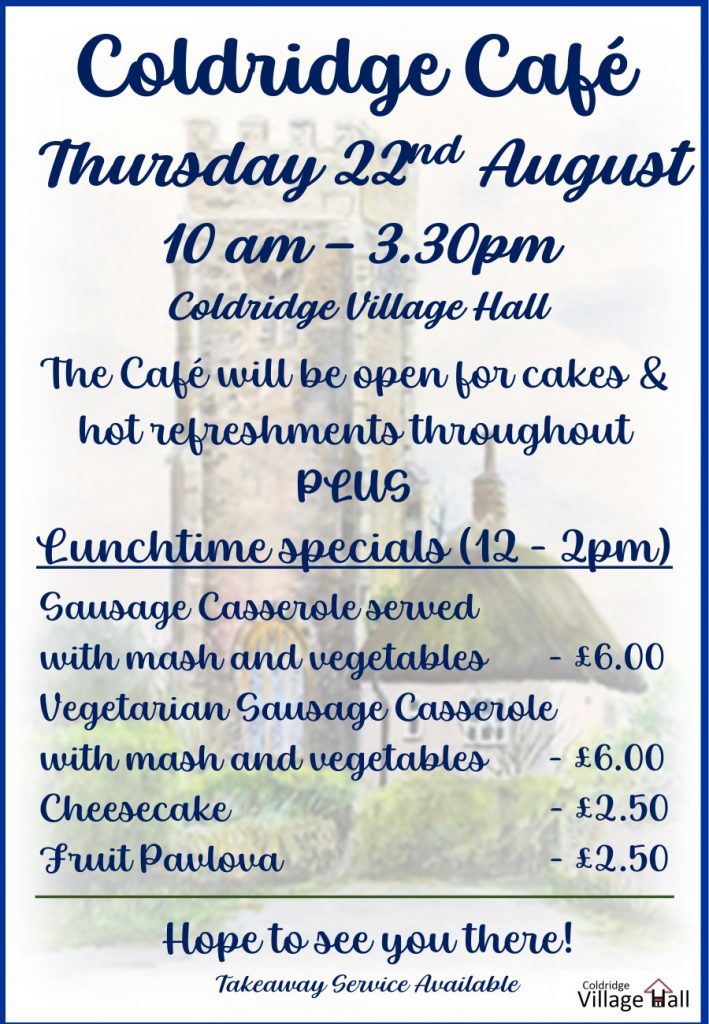 Our Coldridge Cafe will be returning on Thursday 22nd August, with a mouthwatering choice of cakes, refreshments and lunch options. This month’s lunchtime specials menu can be found below…