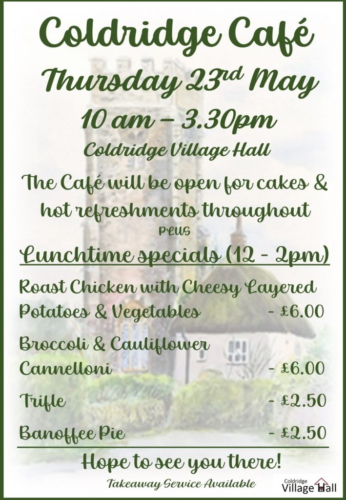 Our May 2024 Coldridge Café in the Village Hall will take place on Thursday 23rd from 10 am. Details of the lunchtime menu are provided below.