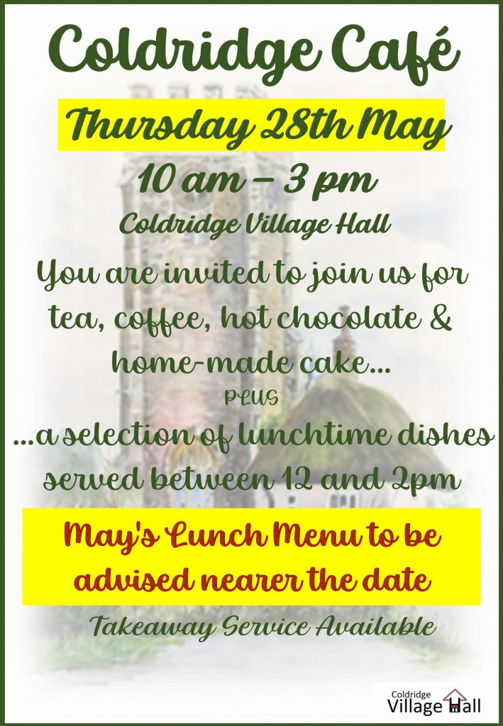 Then why not come along to May’s Coldridge Café and enjoy something special from the ‘menu of the day’ which includes cakes, hot & cold beverages along with our hot-lunch option, (mains and dessert), served between noon and 2pm on the day.