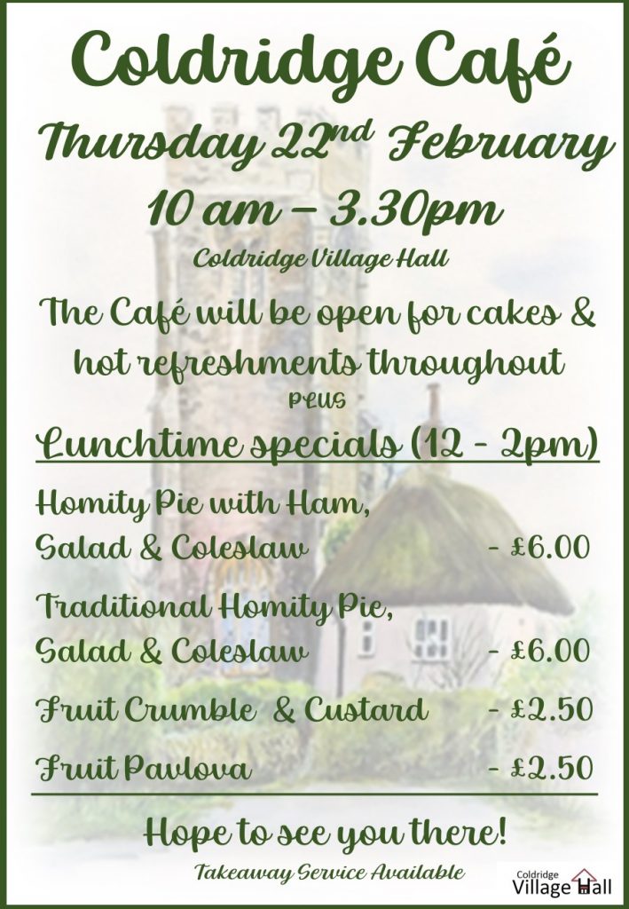 Our next Coldridge Café in the Village Hall will take place on Thursday 22nd February. Details of the lunchtime menu are now available below.