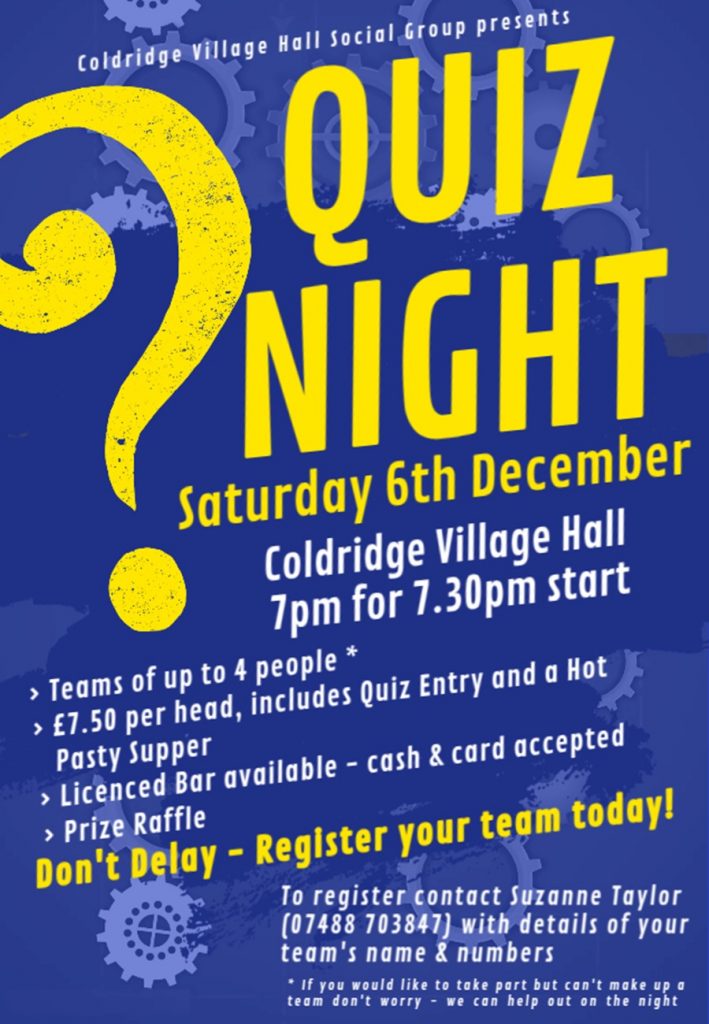 As the nights draw in, it’s time to get your teams together for another night of quizzing as our popular Coldridge Quiz Night returns in the Village Hall on Saturday 6th December!!