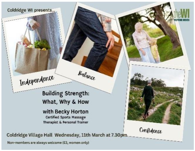 We’re getting moving in March on Wednesday, 11th March at 7.30pm in the Village Hall. If you thought strength training was for competition and fitness models, think again. Gaining and maintaining strength throughout midlife and beyond is vital for illness prevention and well-being. Moderate strength training ensures you’re able to carry on doing what you want to do, whether that’s carrying the shopping, trotting up the stairs or picking up a grand-child. Find out more at ‘Building Strength: What, Why & How’ with Becky Horton, certified and experienced sports massage therapist and personal trainer.