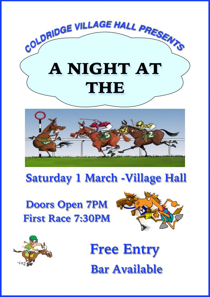 Coldridge Village Hall invites you to take part in a Fun Race Night: Saturday 1st March