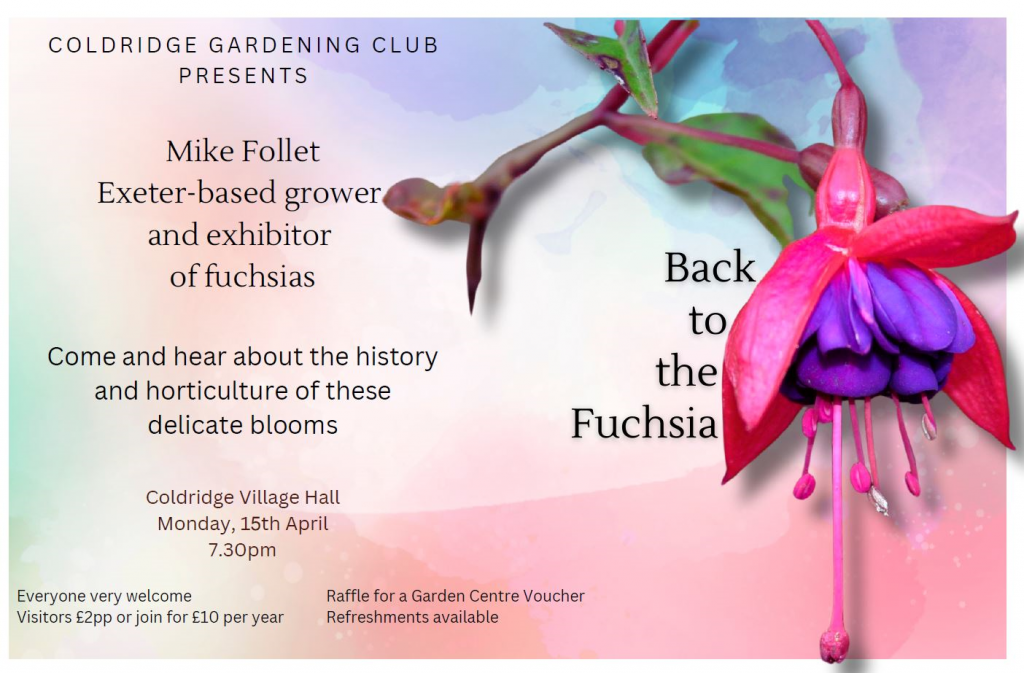 Due to unforseen circumstances, our next Gardening Club meeting will now be held Monday 15th April at 7.30pm when, along with the regular meeting features, we are pleased to welcome Mike Follett who will be giving a talk entitled ‘Back to the Fuchsia’.