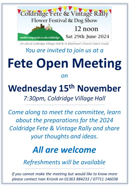 I am pleased to confirm that the 2024 Coldridge Fete Committee will be hosting an Open Meeting for residents of the Parish on Wednesday 15th November – to present and discuss the latest progress on our fete preparations and some of the exciting attractions lined up for our 2024 Coldridge Fete and Vintage Rally.