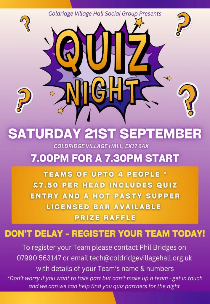 Join us for another entertaining and enjoyable edition of Quiz Night in Coldridge Village Hall. Everything you need to know is provided below.