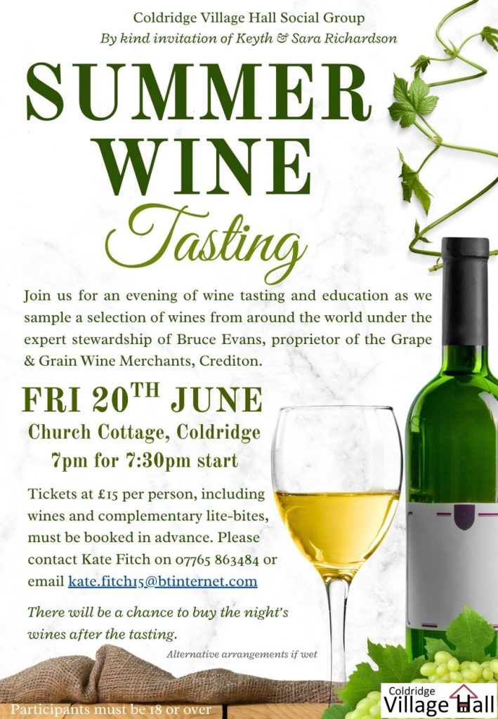 Summer IS coming, and with it we invite you to a Summer Wine Tasting Evening at Church Cottage, Coldridge courtesy of Keyth and Sara Richardson. All the details you need are summarised below….