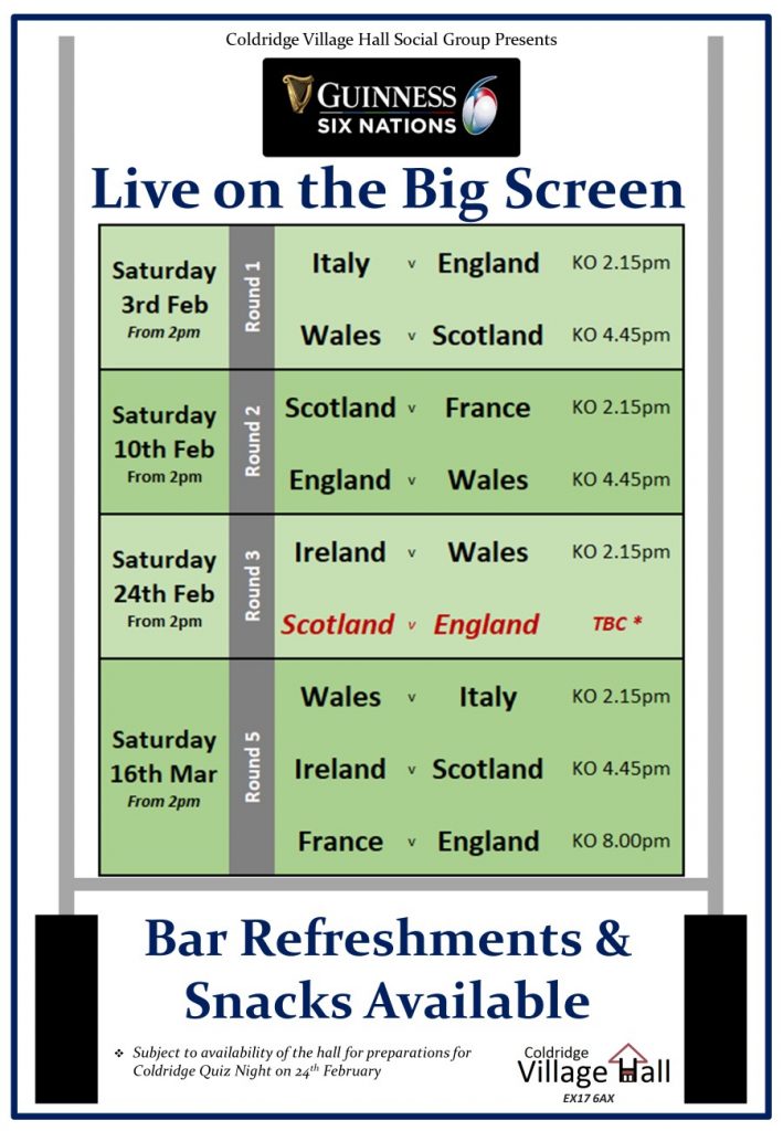 Not long now to wait before the 2024 Six Nations Rugby Union tournament starts on Saturday 3rd February and we are hoping to show a number of the games live on the big screen in the Village Hall during February and March. Please have a look at the flyer below which details current screening plans for the entire 2024 competition – matches and KO timings.