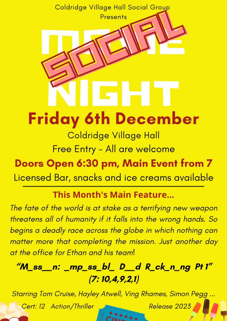 Join us in the Village Hall on Friday 6th December for our final 2024 Coldridge Social Night (with a film).