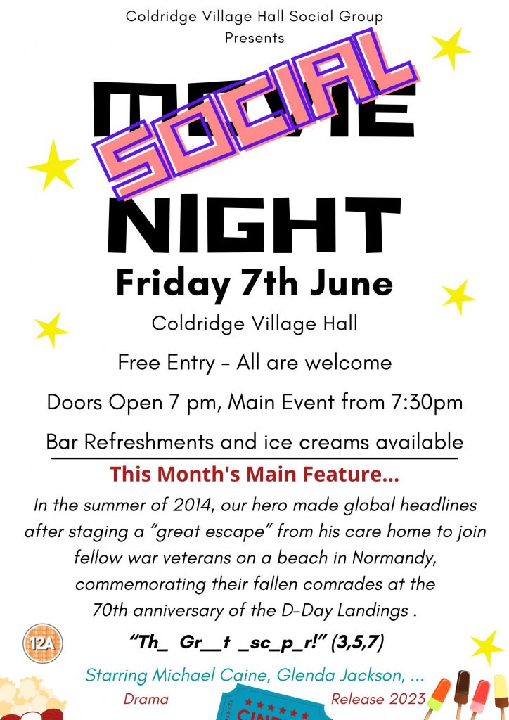 Join us in the Village Hall on Friday evening 7th June for our next 2024 Coldridge Social Night (with a film).