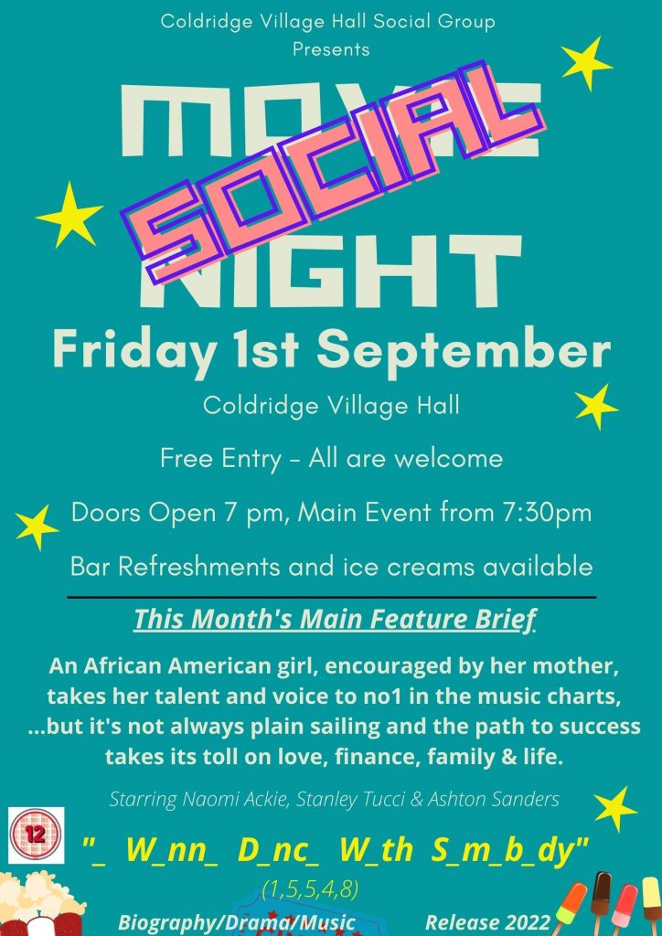 Join us in the Village Hall on Friday evening, 1st September for the our Coldridge Social Night (with a film). The doors open from 7pm, with the main event starting at 7:30pm sharp!!! Bar refreshments, snacks and ice creams will be available to buy. As ever, entry is free and all are welcome.