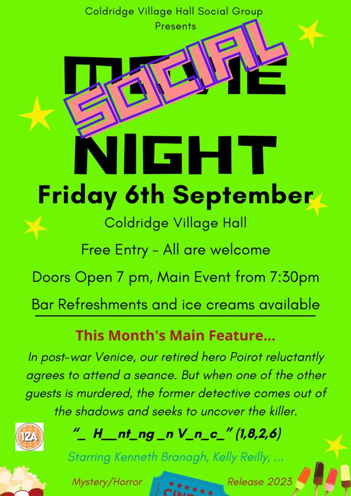 Join us in the Village Hall on Friday evening 6th September for our next 2024 Coldridge Social Night (with a film).