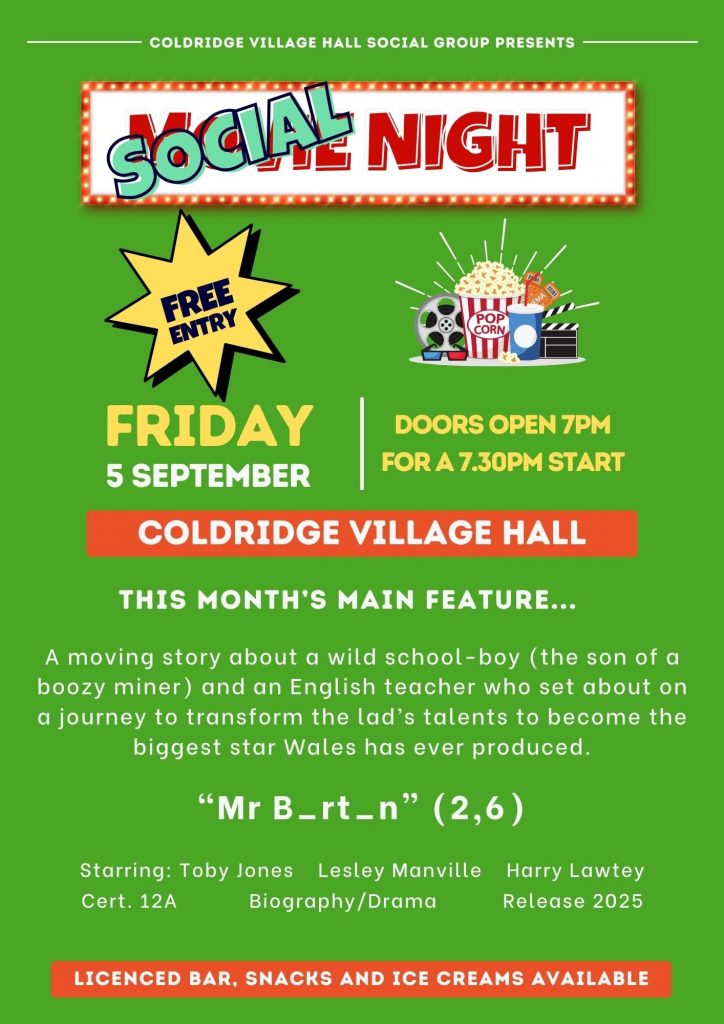 Join us in the Village Hall on Friday evening 5th September 2025 for our next Coldridge Social Night (with a film).