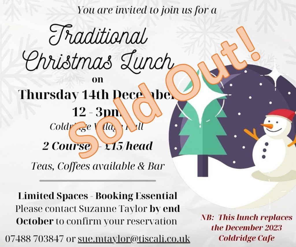 Thank you to everyone who has contacted us to reserve a place at this year’s Coldridge Traditional Christmas Lunch on Thursday 14th December.