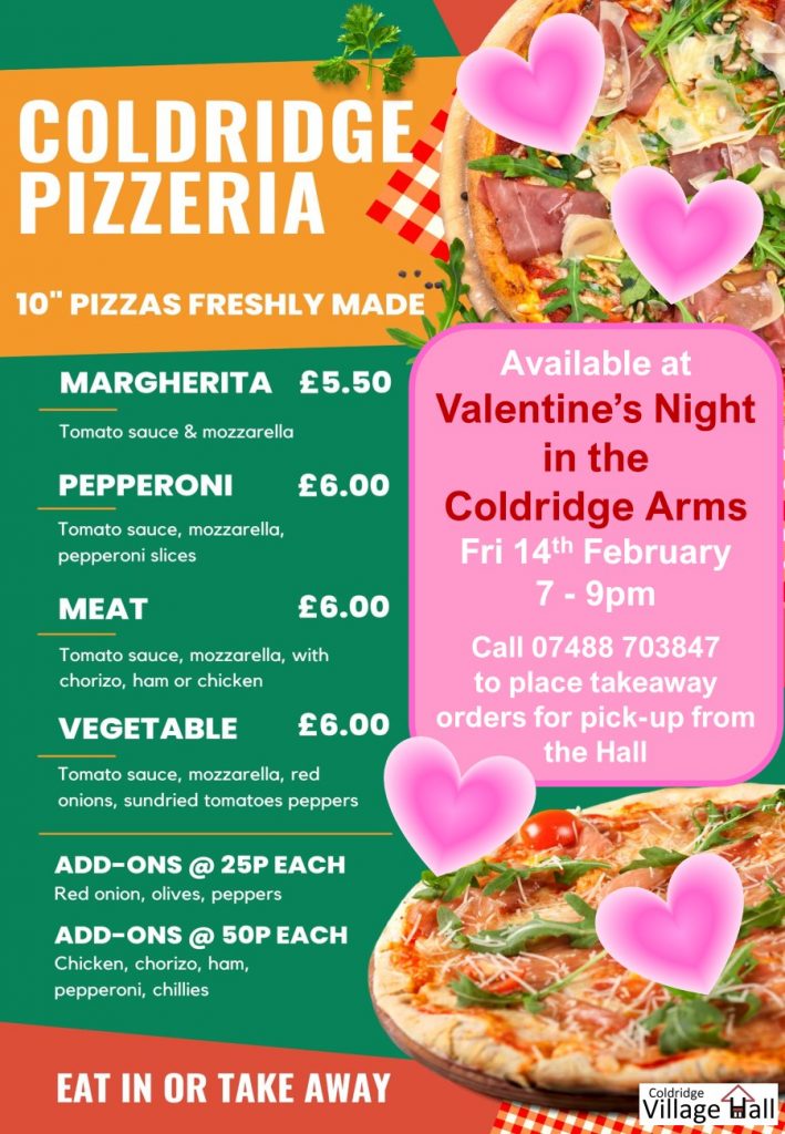 Coldridge Pizzeria: As a treat, freshly prepared pizzas will be available to order alongside the ice-creams and chocs from the bar. Last orders for Pizzas will be at 9pm, with eat-in or takeaway options available. See separate menu flyer below for pizza menu options and how to place advanced takeaway orders.