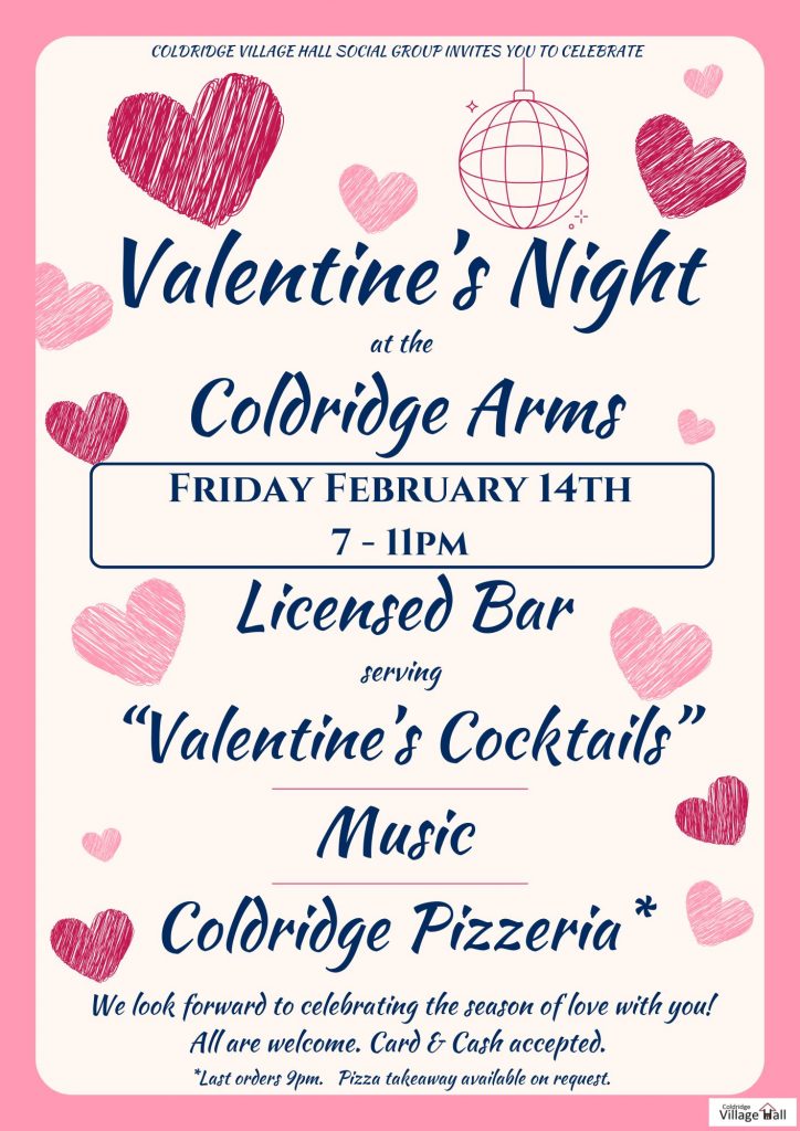 The Coldridge Arms will be opening its doors once again on Friday 14th February from 7pm for a special night as we celebrate the love and romance of Valentine’s Day! As ever all are welcome to drop by and join-us on the night.