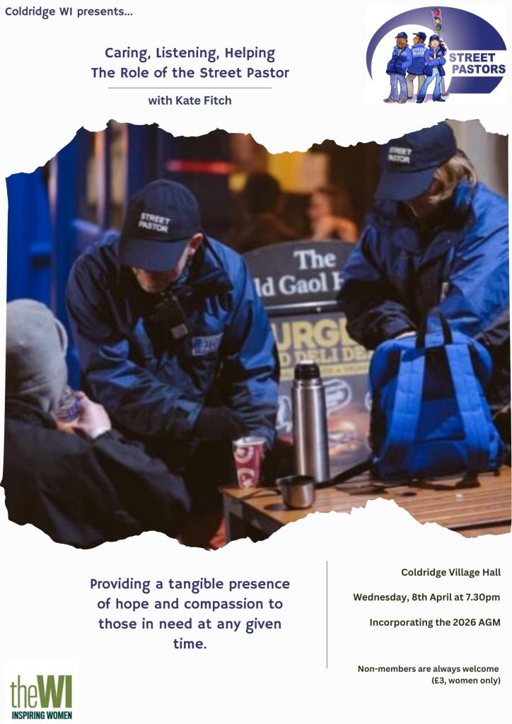 “April’s session will be a meeting of two halves; first, the AGM with committee reports reviewing the old year and looking forward to what’s coming up followed by a talk from Coldridge’s own Kate Fitch about her work as a Street Pastor.