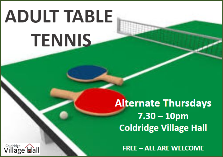Every other Thursday from 7pm*, the Village Hall hosts an informal social evening of Table Tennis.