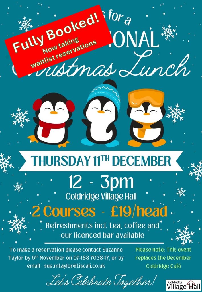 There will be no Coldridge Café in December as this has been replaced by our Traditional Christmas Lunch event on Thursday 11th December.