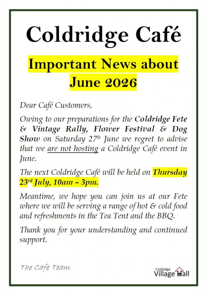 The Coldridge Café opens its doors on the fourth Thursday of each month between 10am and 3pm* in the Village Hall.